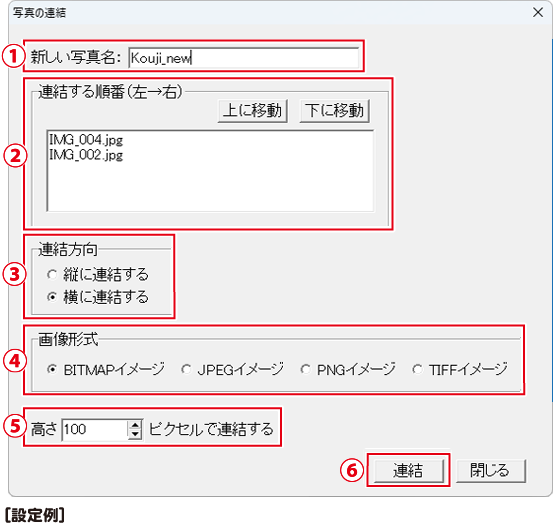 写真の連結画面が表示されますので、各項目を設定します。