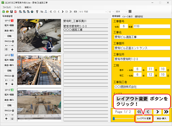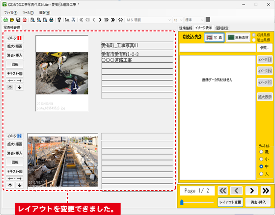 レイアウト変更 ボタンクリックして、ページレイアウト変更画面を表示します。