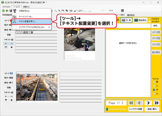 ページ単位で設定したい場合は、メニューバーの[ツール]→[テキスト配置変更]を選択すると、テキスト位置変更画面が表示されます。