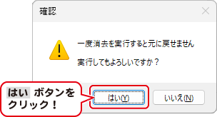 確認画面の内容を確認して、はい ボタンをクリックすると、消去が実行されます。