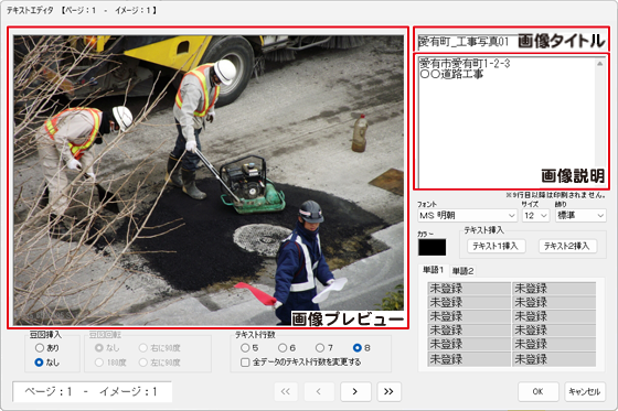 | テキスト挿入 | 初期設定画面で設定した[入力補助用テキスト1・2]を画像説明に挿入します。 |