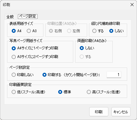 [印刷する]を選択すると、写真ページを印刷する際に右下にページ数を印刷します。