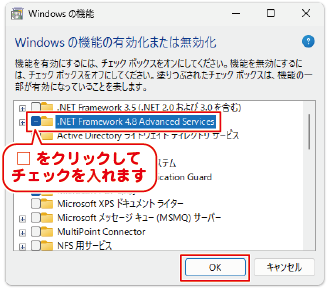 「Windows の機能の有効化または無効化」※を表示し、 「□ .NET Framework4.8」