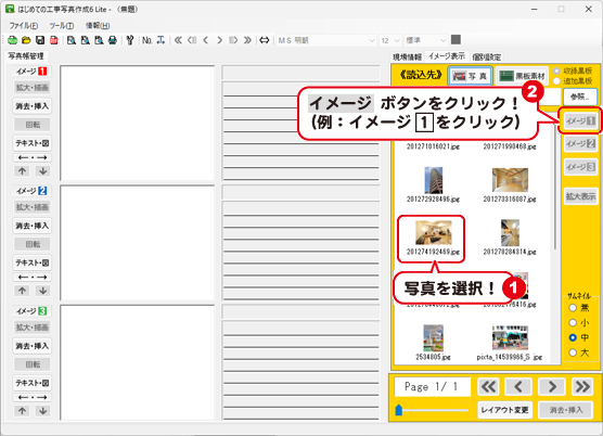 [イメージ表示]内の写真一覧から、写真帳に取り込む写真を選択します。