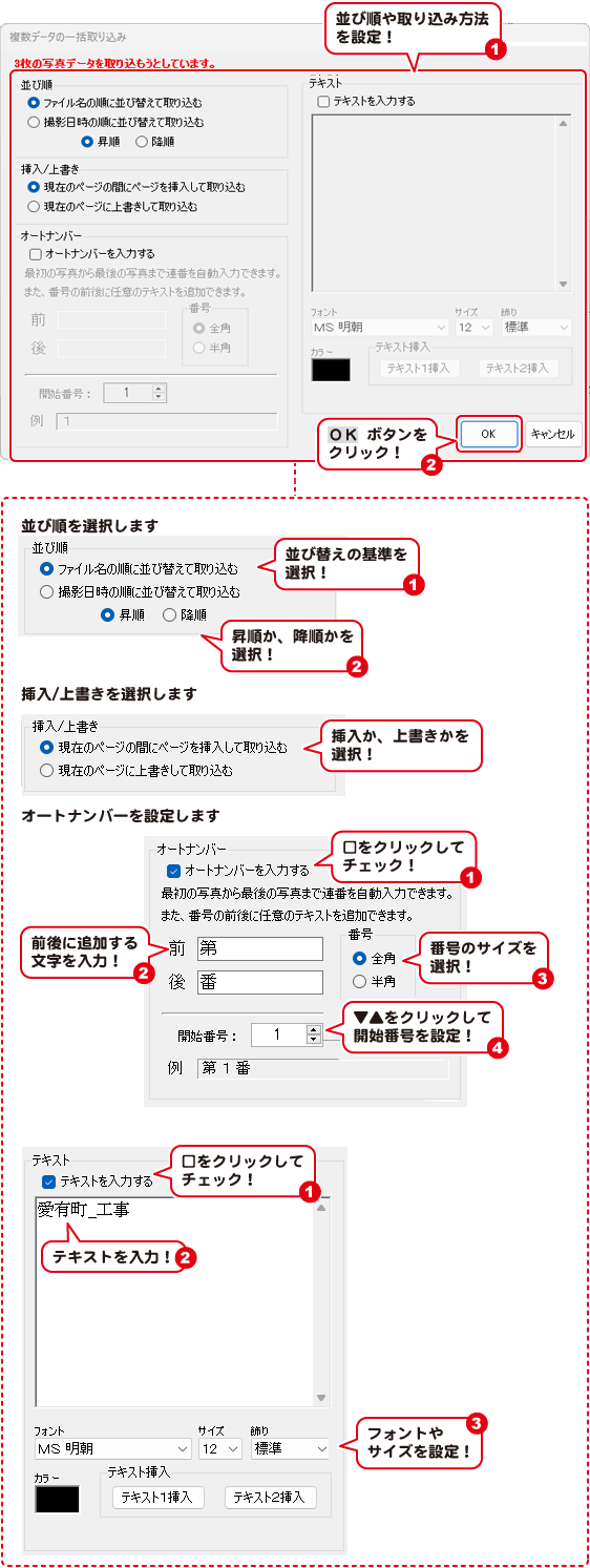 取り込む並び順と、挿入/上書きなどの設定をしてOK ボタンをクリックすると、