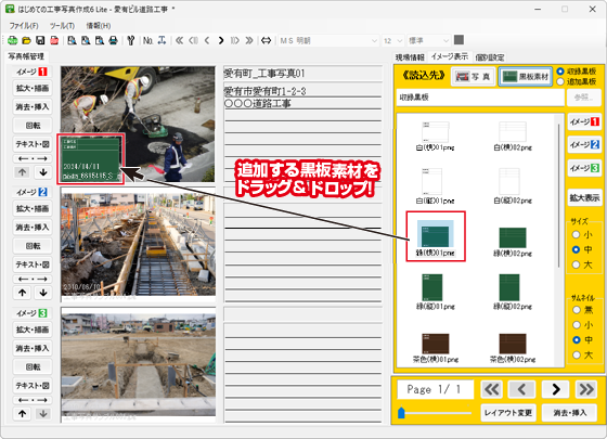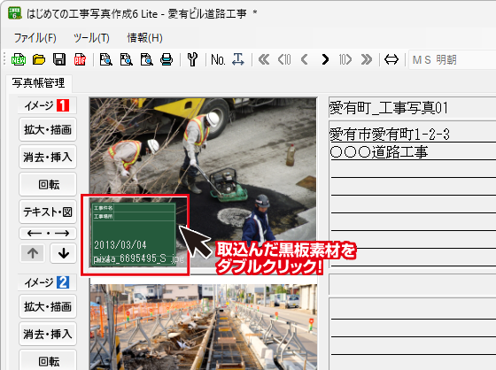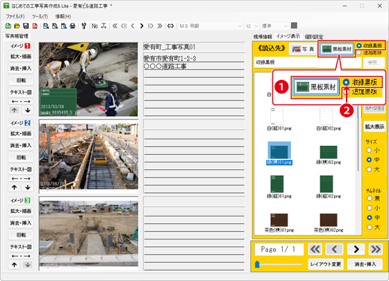 (オリジナルの黒板素材を工事写真に取込む操作は こちら から)