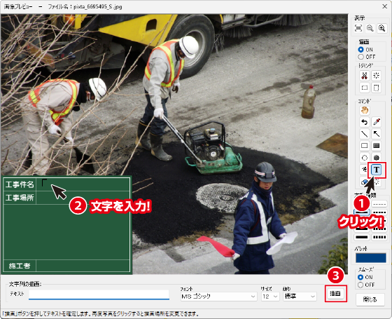 文字を入力し[描画]ボタンをクリックして確認後、画面を閉じます。