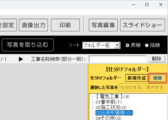 仕分けフォルダーに写真を登録している場合は、フォルダーの削除と同時に写真を写真整理帳から削除するか、または写真自体は削除せずにフォルダーから除外する方法があります。