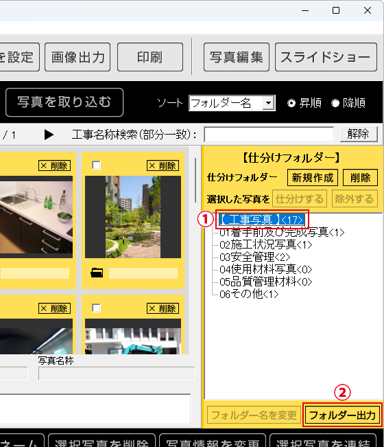 ①出力するフォルダー名(または写真整理帳名)を選択します。