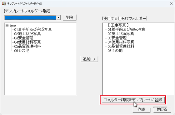 右側のフォルダー構成をテンプレート登録する場合は、フォルダー構成をテンプレートに登録ボタンをクリックします。