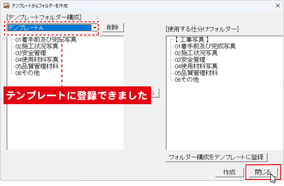 閉じるボタンをクリックして、「テンプレートからフォルダーを作成」画面を閉じます。