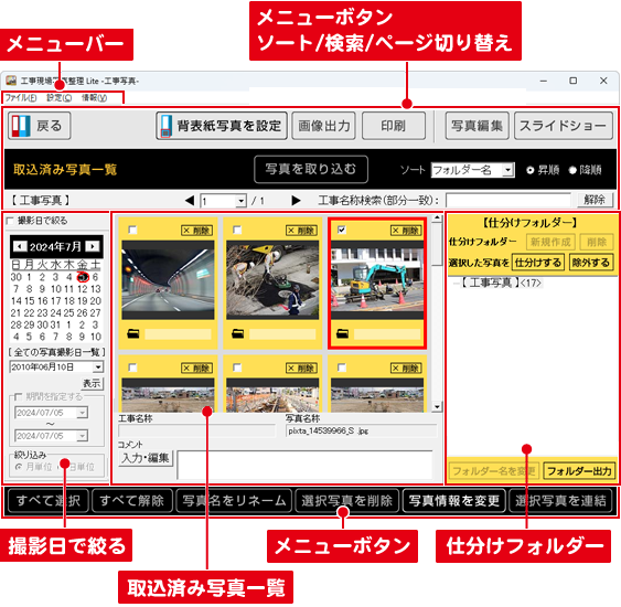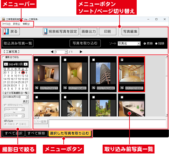 | ソート(昇順・降順) | 取込済み写真一覧の並び順を、フォルダー名、写真名、撮影日時、更新日時で並び替えます。 |