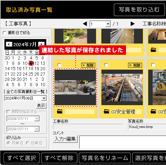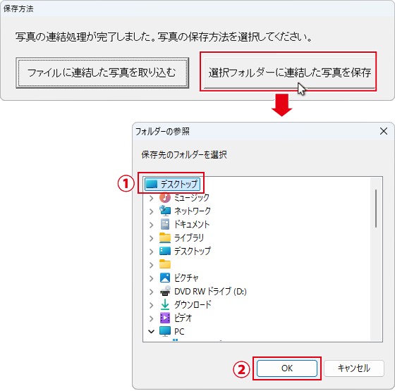選択フォルダーに連結した写真を保存ボタンをクリックします。
