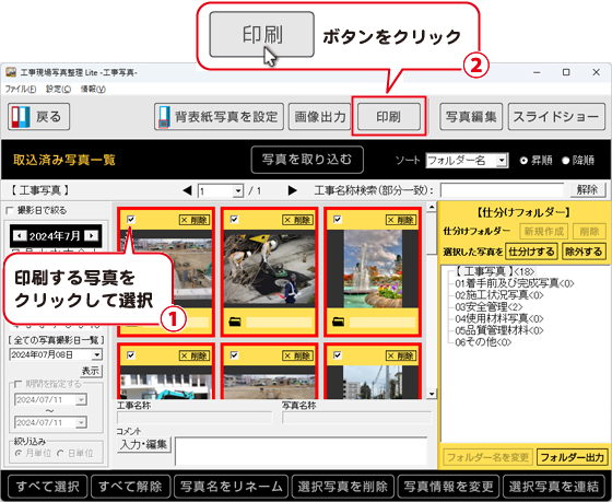 ①印刷する写真をクリックして選択します。(赤枠で選択状態)
