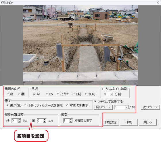 ⑥印刷結果を見て、印刷位置を調整する場合は数値を設定します。
