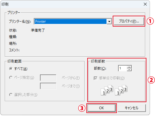 ①プロパティボタンをクリックして、プリンターの詳細設定をします。