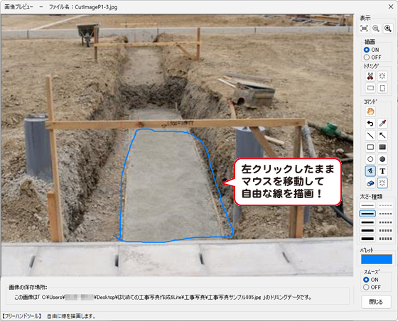 写真の上にマウスポインターを合わせて左クリックしたままマウスを移動して自由に線を描画します。
