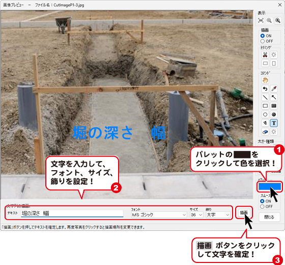 文字の設定がすべて終わりましたら、[文字列の描画]設定欄にある 描画 ボタンをクリックすると、