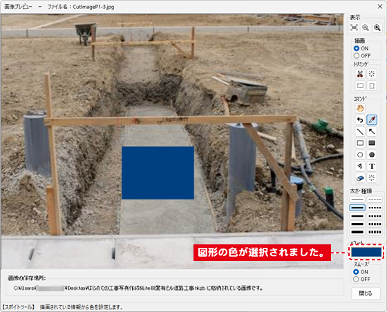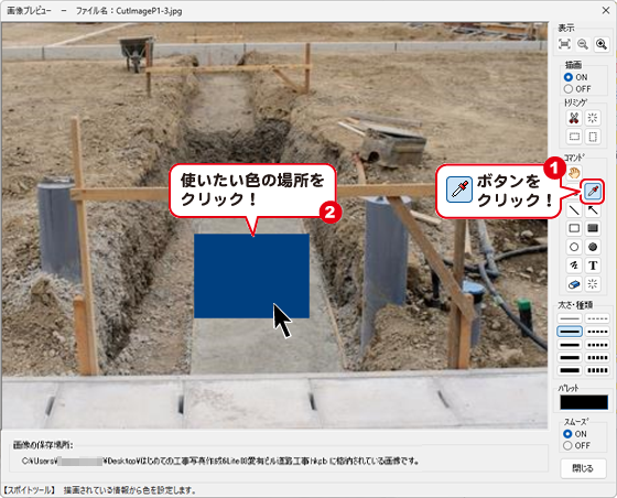 ボタンをクリックして、写真上に描画されている図形などから、使いたい色の部分をクリックします。
