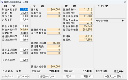 社員(従業員)の給与/賞与計算の際の勤怠入力や、金額訂正・金額調整を行う画面です。