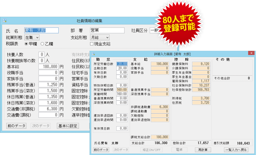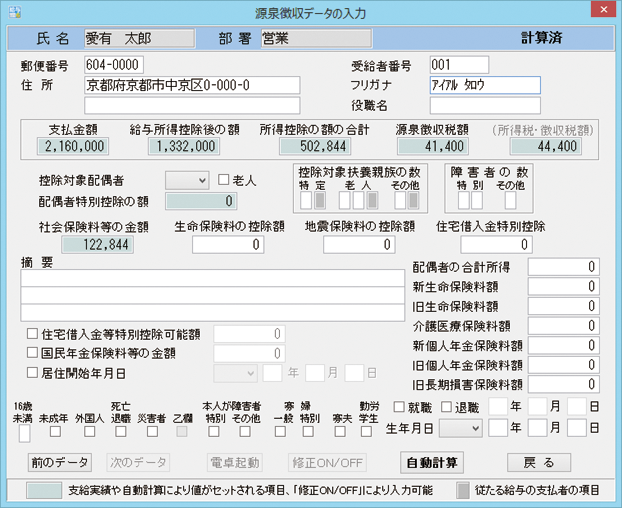 自動計算して給与明細書・源泉徴収票を印刷できるソフトです。