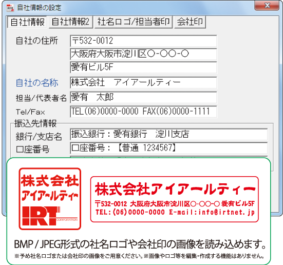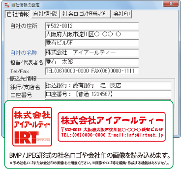予め用意した自社のロゴ画像や社判、印鑑の画像(BMP、JPEG形式)を
