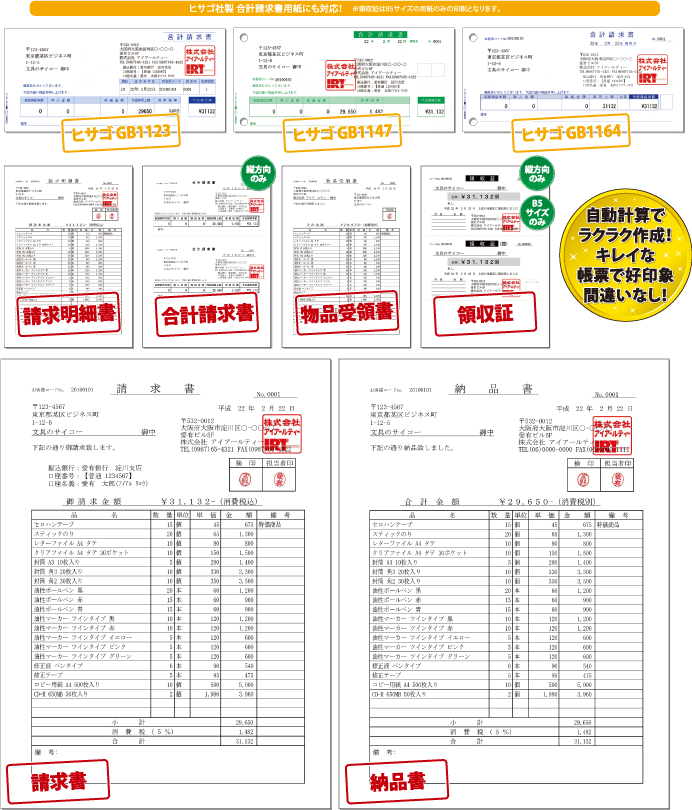 「納品書」「請求書」「請求明細書」「物品受領書」「領収証」「合計請求書」