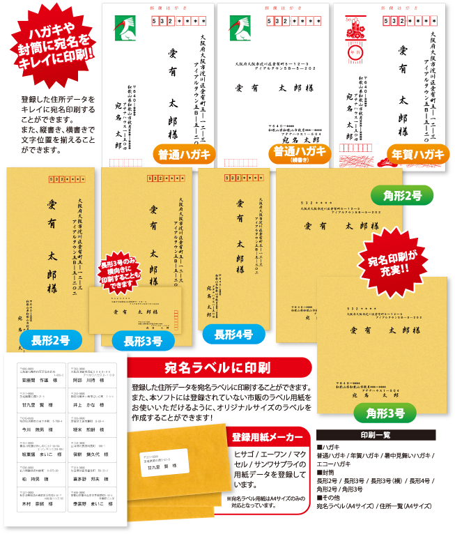 印刷テンプレートも増え、封筒・ハガキ・タックシールに宛名印刷ができます。