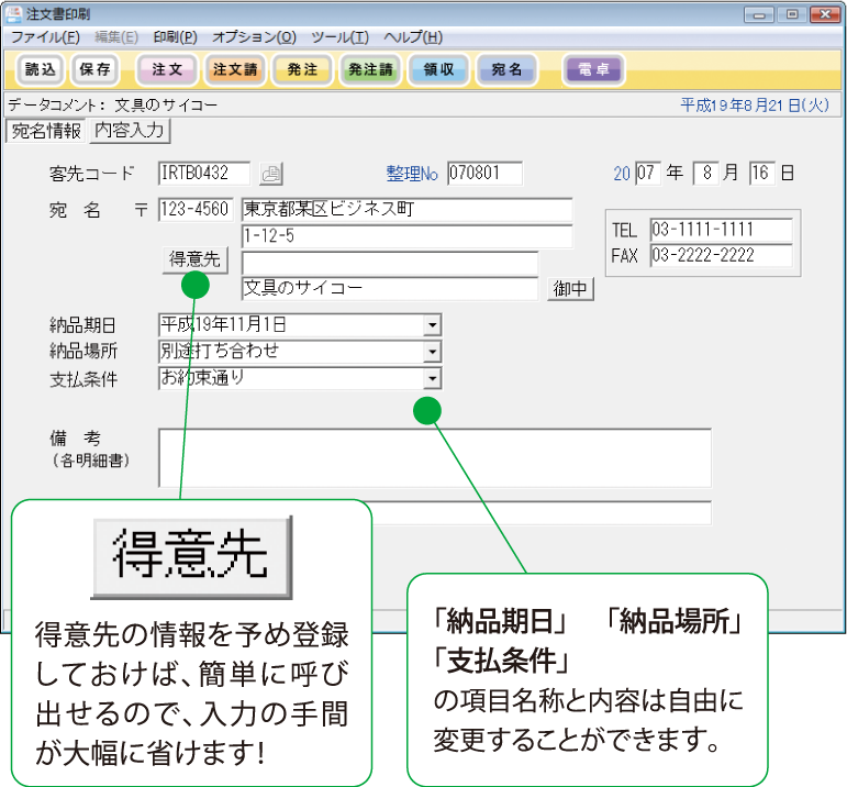 お得意様の宛名や住所、電話番号等を登録しておくことができます。