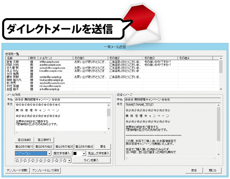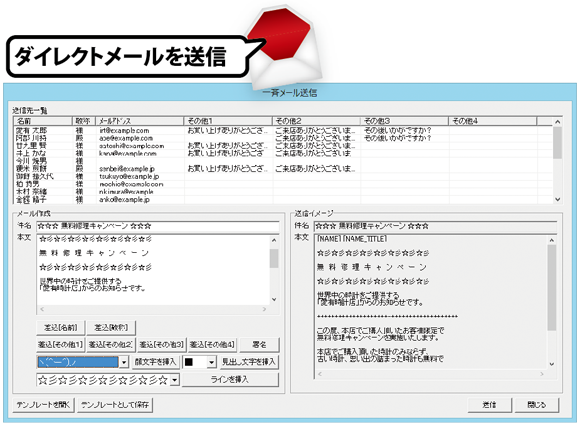 登録した各得意先(お客様)のメールアドレスに一斉にメールを送信します。