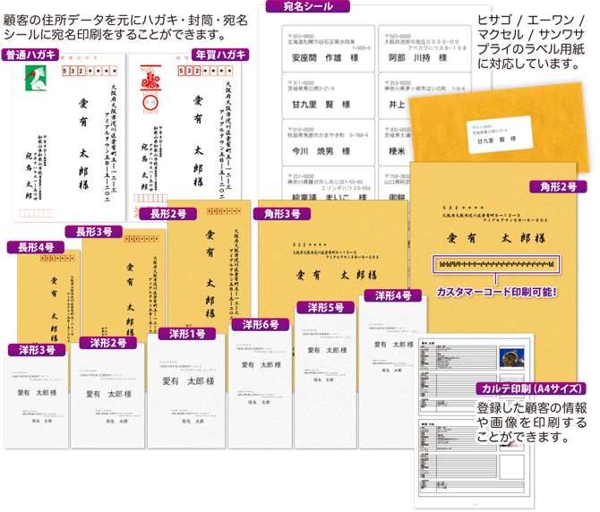 得意先(お客様)の情報を住所録として登録、登録した方に対して封筒(長形・角形・洋形)、