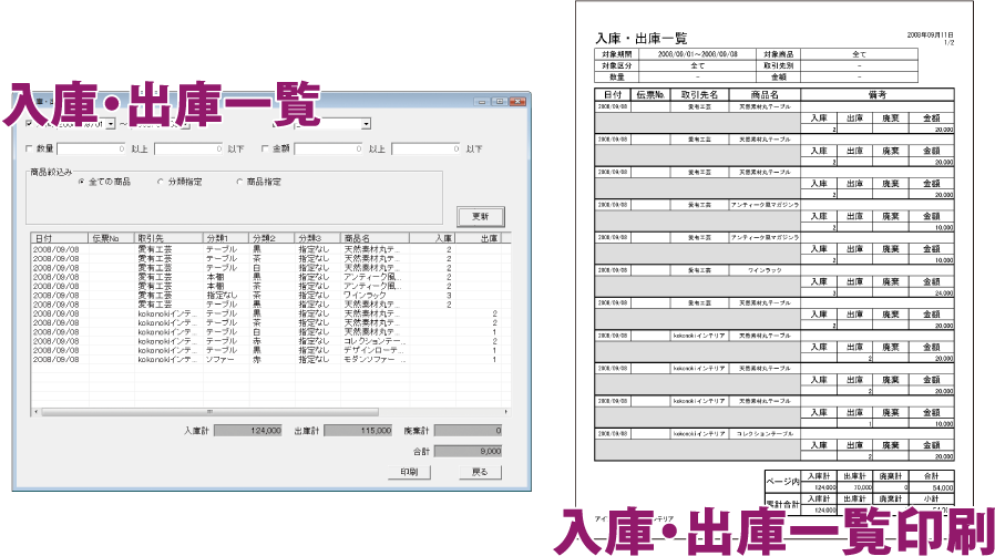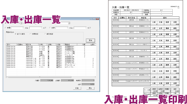 入庫や出庫、不良品や廃棄商品のデータの印刷(入庫伝票・出庫伝票・廃棄伝票)、在庫集計の結果の印刷(在庫一覧)、入庫や出庫の一覧の印刷(入庫・出庫一覧)、棚卸結果の印刷(棚卸)ができます。