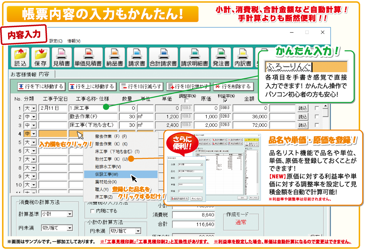 得意先、自社情報、内容(品名・単価・単位・金額・原価)を入力して帳票を 作成します。