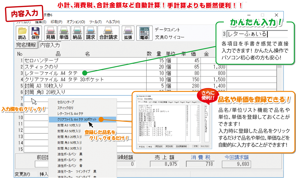 品名・単価・単位・金額などの内容を入力して帳票を作成します。