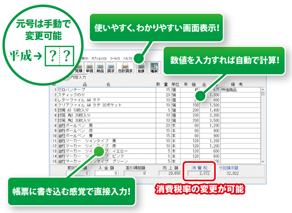 得意先、自社情報、明細(品名・数量・単位・単価)を入力して帳票を作成します。