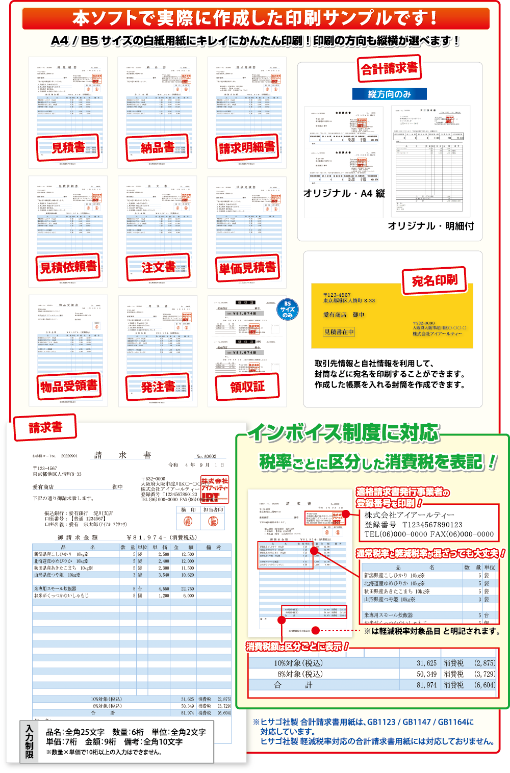 【OSについて】 ※上記OSが正常に機能し、OSの最低動作環境を満たしていることが前提です。 ※日本語版32bitOSのみの対応です。各種ServerOSには対応しておりません。 ※デスクトップモードのみ対応です。 ※最新のサービスパック(SP)及び各種パッチが適用されている環境が前提です。 ※管理者権限を持ったユーザーでインストールし、お使いください。 ※マイクロソフトのサポート期間が終了しているOSでの動作は保証いたしません。 【ご注意】 ※「見積・納品・請求書1、2、3、4、5、6、7」以外の他のソフトとの互換性はありません。 ※「見積・納品・請求書6、7」のみ自動で設定を移行します。 ※パソコン環境によっては、パソコンの動作に遅延等が見られる場合もありますのでご注意ください。 ※本ソフトでは適格請求書の各税率の消費税額は備考欄に印刷されます。 ※非課税金額で帳票を作成する際は別途外税で金額を入力して作成してください。 ※内税に設定した場合も消費税額が表示・印刷されますのでご注意ください。 ※登録番号を印刷できる帳票は「納品書」「請求書」「請求明細書」「合計請求書」「領収書」に ※画像やロゴ等を編集・作成する機能はありません。 ※社判、会社印の画質・品質は元の画像に依存します。 ※BMP / JPEG / PNGファイルは、一般的なWindows標準のファイルを基準としています。 ※一つのフォルダーに保存できるファイル数は300件までとなっております。 ※自社の名称のフォントはお使いのパソコンのフォントから選択して使用することができます。 ※環境依存文字、特殊文字、外字は使用できない場合があります。 ※入力可能な文字数、印刷される文字数は、項目ごとに制限があります。 ※見積書 / 単価見積書 / 納品書 / 請求書 / 請求明細書 / 合計請求書 ※領収証はB5サイズ用紙への印刷のみとなります。 ※振込先を2種類印刷する際は備考欄に2種類印刷されます。 ※宛名を封筒へ印刷する際には、印刷したい封筒サイズに対応しているプリンターが必要です。 ※連名登録・印刷はできません。 ※数量、単価には小数点以下の数値も入力可能です。(小数点第3位まで) ※内容入力の品名、数量、単位、単価、金額は入力できる文字数、桁数に制限があります。 ※品名の項目は文字数によって自動的に文字サイズが設定されます。 ※レイアウトや、文字の大きさは固定となっております。 【サポートについて】 ※弊社ではソフトの動作関係のみのサポートとさせていただきます。 ※パソコン本体や各種ハードウェア、また各種ソフトウェアについてのお問い合わせやサポートにつきましては、各メーカーに直接お問い合わせください。 【その他】 ※本ソフトは1台のパソコンに1ユーザー1ライセンスとなっております。 ※本ソフトにはネットワーク上でデータを共有する機能はございません。 ※本ソフトを複数のパソコン上で使用するには台数分のソフトを必要とします。 ※本ソフトを著作者の許可無く賃貸業等の営利目的で使用することを禁止します。 ※本ソフトのソフトウェアの再配布・貸与・レンタル・中古品としての取引は禁止します。 ※本ソフトを複数のパソコン上で使用するには台数分のソフトを必要とします。 ※本ソフトを運用された結果の影響につきましては、当社は一切の責任を負いかねます。 ※著作者の許諾無しに、画像・イラスト・文章等の内容全て、もしくは一部を無断で改変・頒布・送信・転用・転載等は法律で禁止されております。 【商標について】 ※Microsoft、Windows、Windows 8.1、Windows 10、Windows 11は、米国Microsoft Corporationの米国及びその他の国における登録商標または商標です。 ※Mac OSは米国および他国のApple Inc.の登録商標または商標です。 ※Intelはアメリカ合衆国および他の国におけるIntel Corporationの登録商標または商標です。 ※その他記載されている会社名・団体名及び商品名などは、商標又は登録商標です。 ※本製品は、株式会社アイアールティーのオリジナル製品です。 |