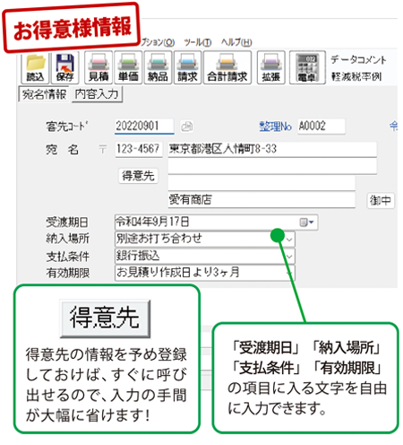 客先コード / 整理No / 宛名 / 日付 / TEL / FAX / 受渡し期日 / 納入場所 / 支払条件 / 有効期限