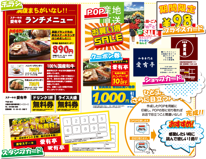 オリジナルデザインの「チラシ」「POP」「割引券」「クーポン」などをデザインして作成し、