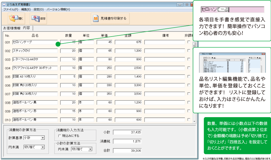 商品名・数量等を入力し、印刷ボタンを押すだけで