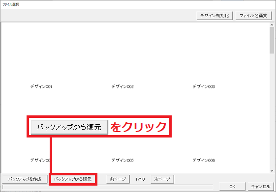 バックアップから復元ボタンをクリックします。(下図例:ファイル選択画面)