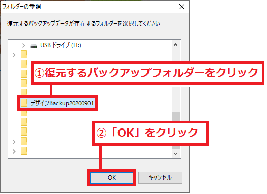 復元するバックアップフォルダーを選択して