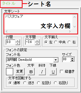 | 太字 | 選択中の文字、文字シート内の文字を太文字に変更します。 |