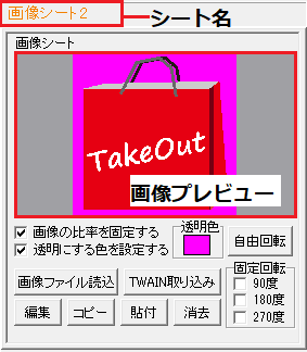 | 消去 | 画像シートに読み込んだ画像を消去します。 画像のみを消去するので画像シートは残ります。 |
