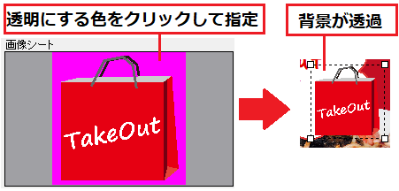 読み込んだ画像は透明色を指定(1色のみ)して透過できます。