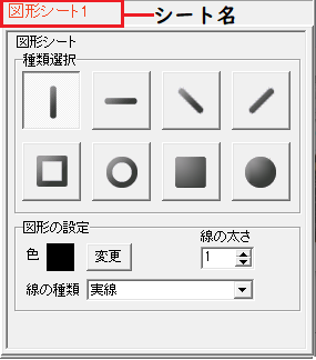 シート編集エリアでは「図形の種類」「色」「線の太さ」「線の種類」を設定します。