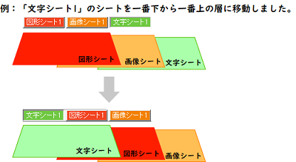 複数のシートがある場合、他のシートに対して重なり順を変更できます。 ▲前面へボタンをクリックする度に ひとつずつ上へシートの位置が変わります。 ▼背面へボタンをクリックする度に ひとつずつ下へシートの位置が変わります。