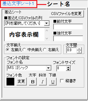 | 差込むCSVファイルの列 | ▼をクリックして、 CSVファイルのデータの列を選択します。 ※差し込むデータは差込シートごとに設定します。 |