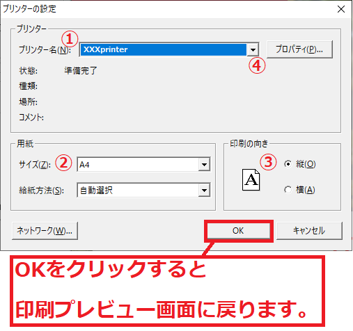 ①プリンター名:印刷するプリンタを▼をクリックして選択します。