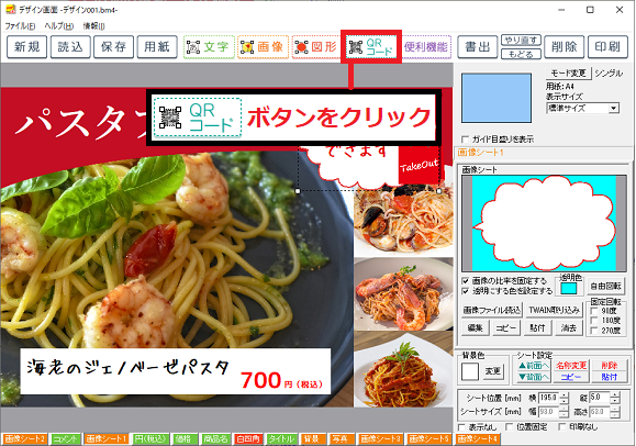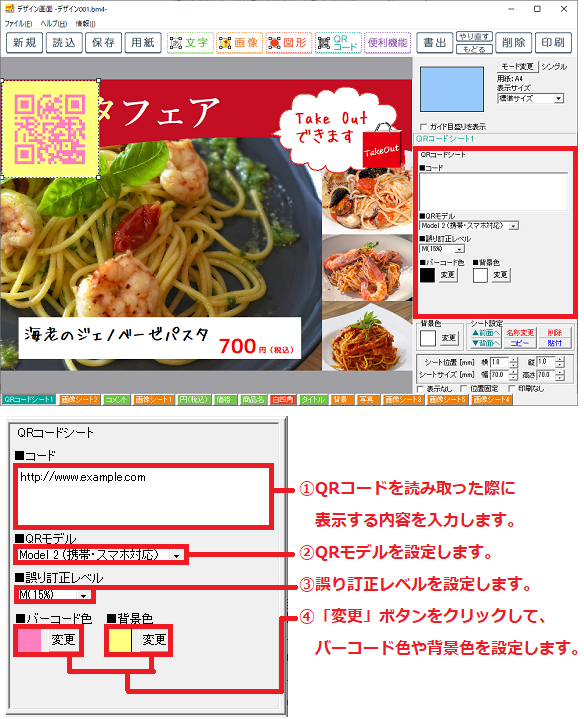 画面右側のシート編集エリアでQRコードシートの各項目を設定します。