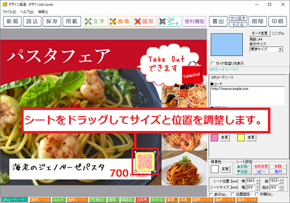 QRコードの設定が終わりましたら、シートの位置とサイズを調整します。